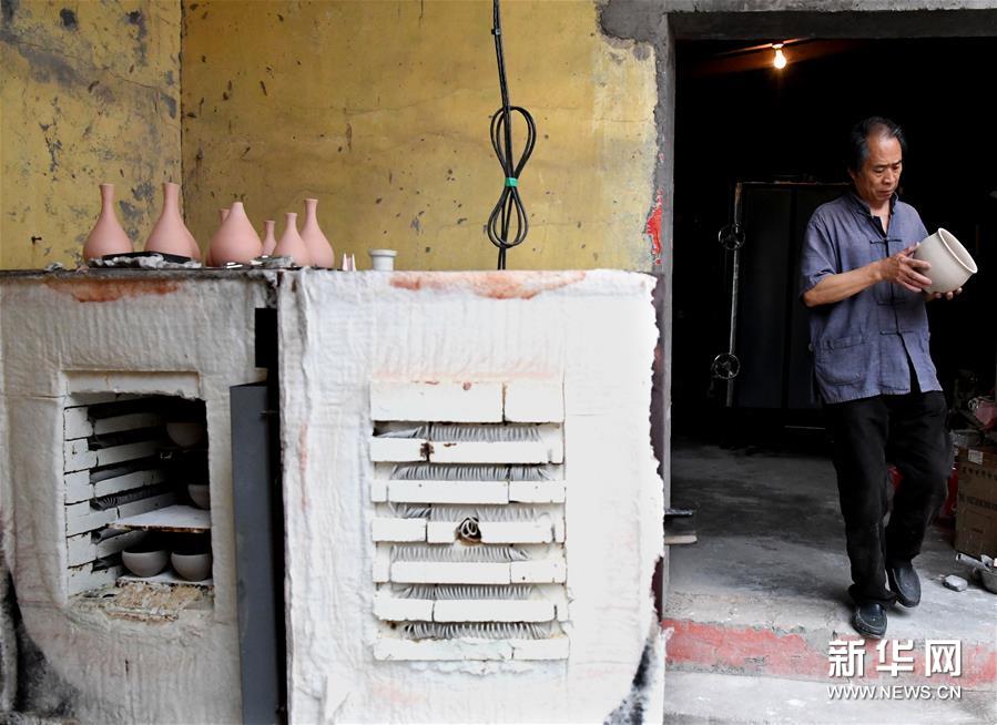 在河南省巩义市站街镇小黄冶村的工作室里,游光明在装窑(6月19日摄)。新华社记者 李安 摄