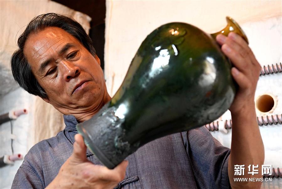 在河南省巩义市站街镇小黄冶村的工作室里,游光明在观察烧制好的器物釉色(6月19日摄)。新华社记者 李安 摄