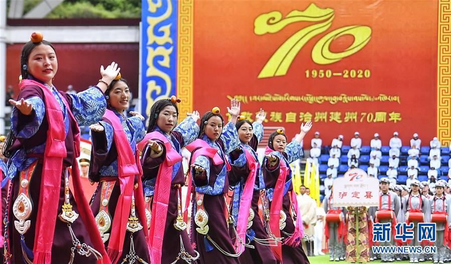 9月17日,德格县群众在甘孜藏族自治州成立70周年庆祝大会上进行文艺演出。 当日,四川甘孜藏族自治州成立70周年庆祝大会在康定市举行。各地群众身着缤纷多彩的民族服饰,载歌载舞,共庆建州70周年。 新华社记者 刘坤 摄