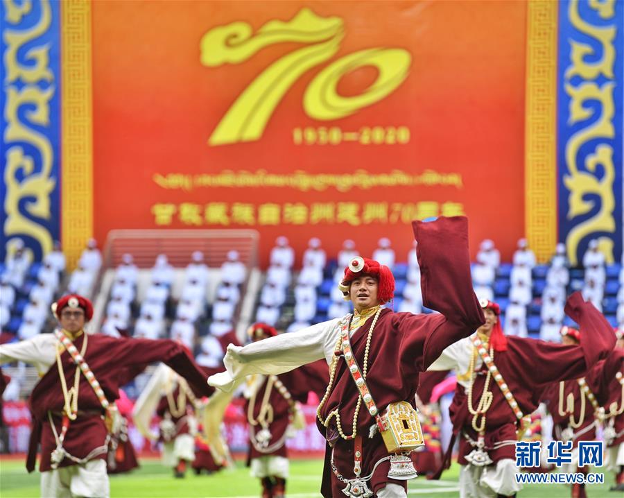 9月17日,群众在甘孜藏族自治州成立70周年庆祝大会上进行文艺演出。 当日,四川甘孜藏族自治州成立70周年庆祝大会在康定市举行。各地群众身着缤纷多彩的民族服饰,载歌载舞,共庆建州70周年。 新华社记者 刘坤 摄