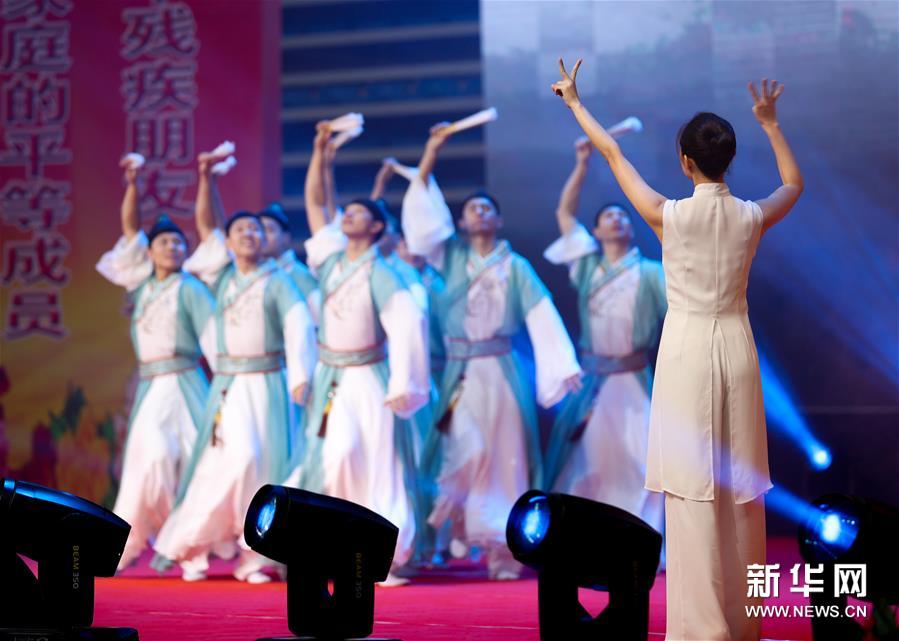 9月17日,中国残疾人艺术团的舞蹈演员在宁夏固原市西吉县体育馆表演《纸扇书生》。新华社记者 杨植森 摄