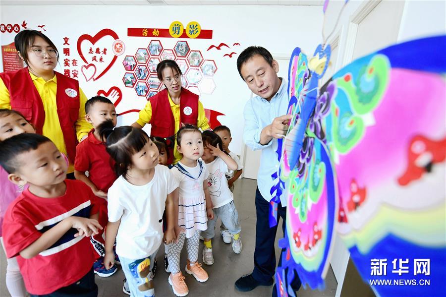 9月17日,在廊坊市安次区新时代文明实践中心,安次区第什里风筝制作技艺传承人赵艳强(右一)为小朋友讲解风筝制作。新华社记者 王晓 摄