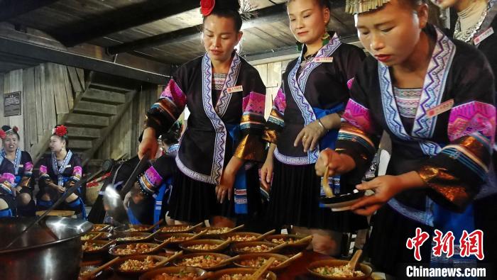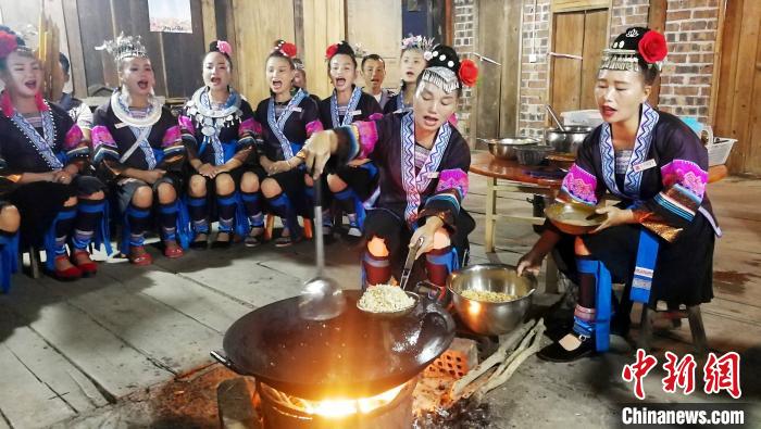 图为梦呜苗寨居民唱着民歌为游客打油茶。 翟李强 摄