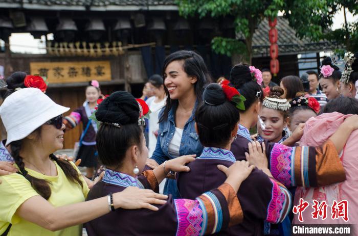 图为梦呜苗寨居民与游客互动。 翟李强 摄