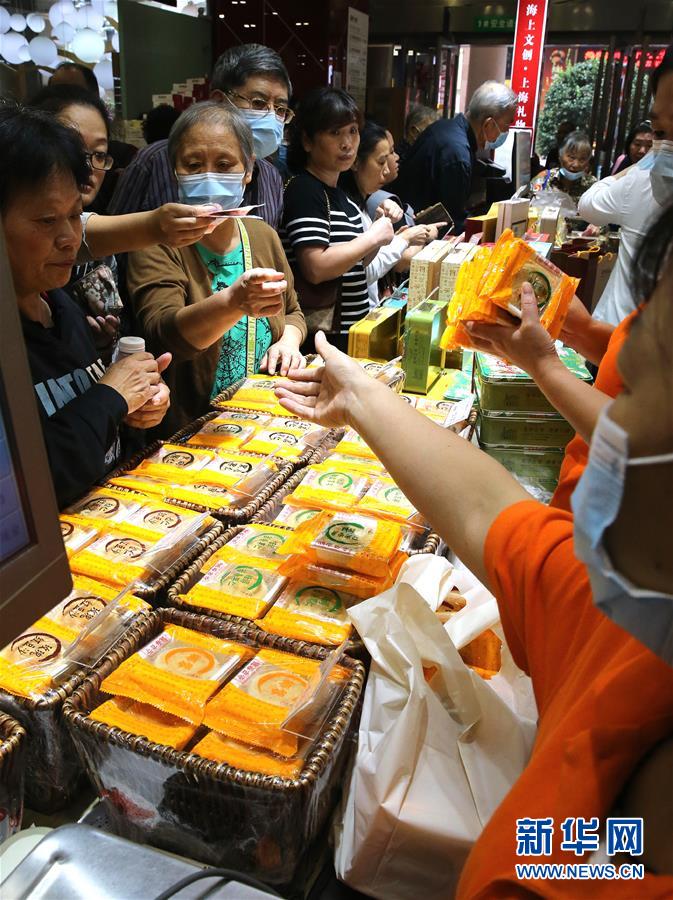 9月20日,在上海南京路上的一家商场内,顾客购买散装月饼。 中秋临近,上海一些商家和老字号食品企业推出的散装月饼以丰富的品种和实惠的价格吸引顾客选购。 新华社记者 陈飞 摄