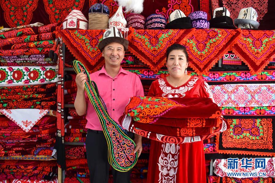 9月20日,在新疆阿克陶县丝路佳苑手工艺合作社内,艾拉努尔·吾普尔(右)和丈夫乃再尔·依迪西(左)展示绣品。艾拉努尔·吾普尔和丈夫开了一家手工艺合作社,带动了周边20户搬迁居民就业。 在新疆阿克陶县丝路佳苑易地扶贫搬迁安置点内,居住着6000多名从昆仑山深处搬迁下来的居民。近年来,当地政府持续加强易地搬迁后续扶持力度,因地制宜发展包括传统手工艺制作在内的多种产业,让居民在安置点“搬得下、稳得住、能致富”,助推搬迁户脱贫。 新华社记者 高晗 摄