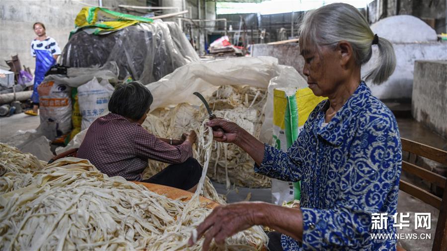 9月19日,在广西大化瑶族自治县贡川乡贡川村的一家民间造纸作坊,村民在挑选制作贡川纱纸的原材料。新华社记者 张爱林 摄