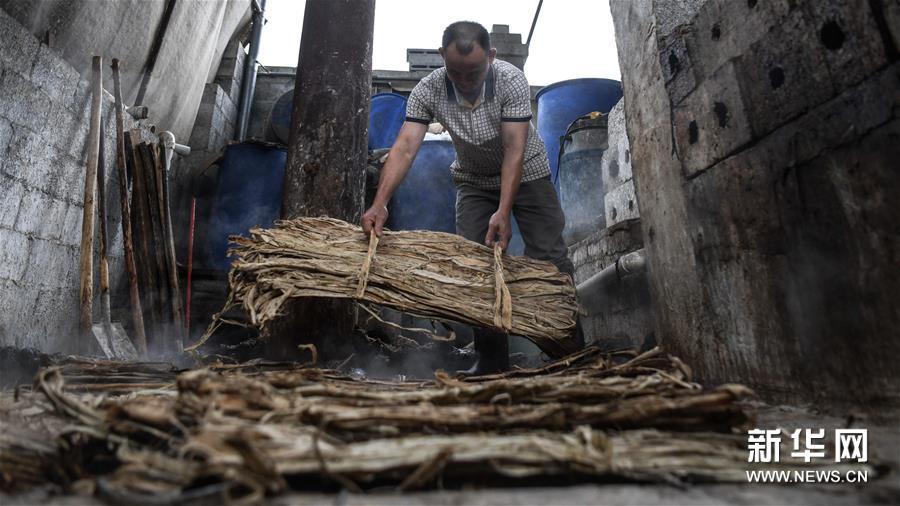 9月19日,在广西大化瑶族自治县贡川乡贡川村的一家民间造纸作坊,村民准备将制作贡川纱纸的原料进行蒸煮。新华社记者 张爱林 摄