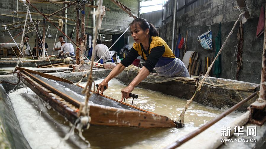 9月19日,在广西大化瑶族自治县贡川乡贡川村的一家民间造纸作坊,村民在捞纸。新华社记者 张爱林 摄