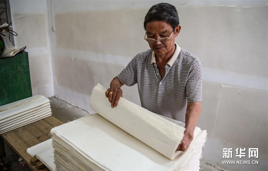 9月19日,广西大化瑶族自治县贡川乡贡川村村民在整理晾晒好的贡川纱纸。新华社记者 张爱林 摄