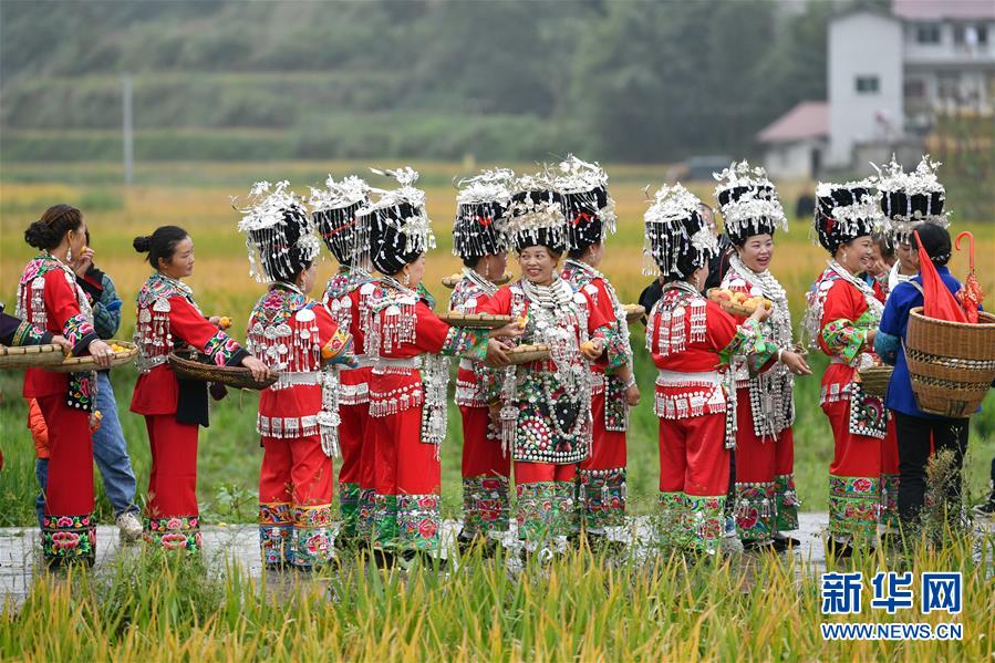 9月20日,在贵州省铜仁市松桃苗族自治县盘石镇当造村,人们游村庆丰收。 9月22日,我国将迎来第三个中国农民丰收节,各地开展多彩活动,喜迎丰收。 新华社发(龙恩泽 摄)