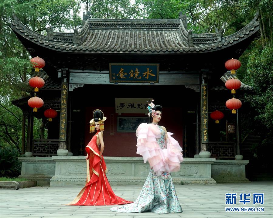 9月21日,模特在展示毛戈平的彩妆作品。 当天,一场名为“气蕴东方”的著名彩妆造型师毛戈平彩妆秀在重庆市万州区万州大瀑布景区上演,中国重庆国际时尚周同日落下帷幕。 新华社记者 陈建力 摄