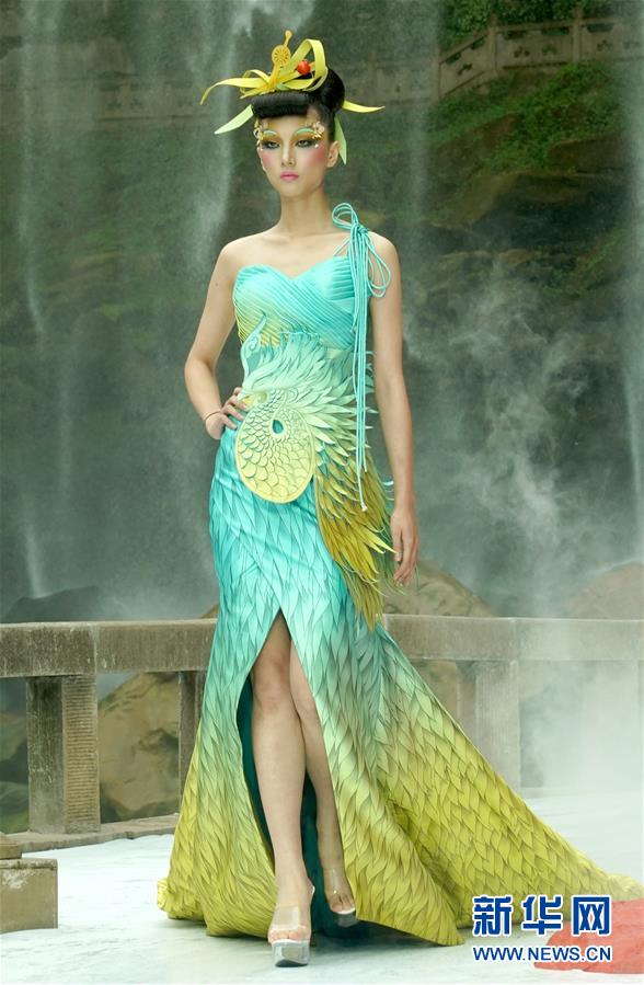 9月21日,模特在展示毛戈平的彩妆作品。 当天,一场名为“气蕴东方”的著名彩妆造型师毛戈平彩妆秀在重庆市万州区万州大瀑布景区上演,中国重庆国际时尚周同日落下帷幕。 新华社记者 陈建力 摄