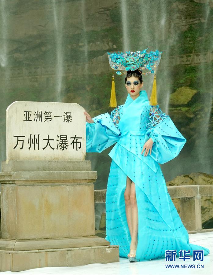 9月21日,模特在展示毛戈平的彩妆作品。 当天,一场名为“气蕴东方”的著名彩妆造型师毛戈平彩妆秀在重庆市万州区万州大瀑布景区上演,中国重庆国际时尚周同日落下帷幕。 新华社记者 陈建力 摄