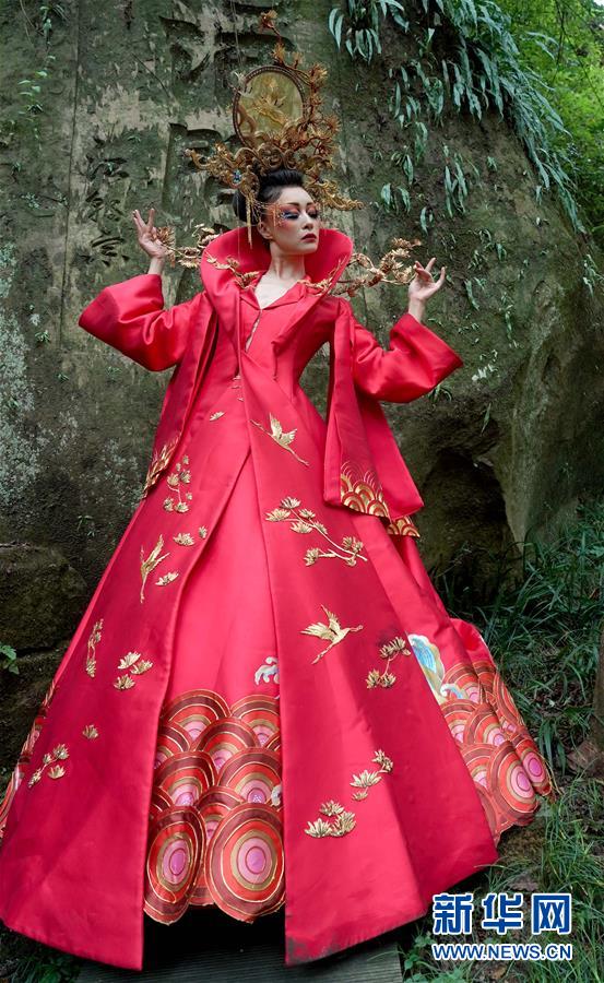9月21日,模特在展示毛戈平的彩妆作品。 当天,一场名为“气蕴东方”的著名彩妆造型师毛戈平彩妆秀在重庆市万州区万州大瀑布景区上演,中国重庆国际时尚周同日落下帷幕。 新华社记者 陈建力 摄