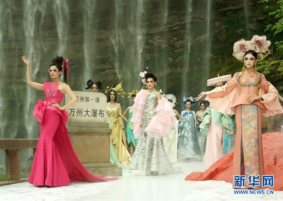 9月21日,模特在展示毛戈平的彩妆作品。 当天,一场名为“气蕴东方”的著名彩妆造型师毛戈平彩妆秀在重庆市万州区万州大瀑布景区上演,中国重庆国际时尚周同日落下帷幕。 新华社记者 陈建力 摄