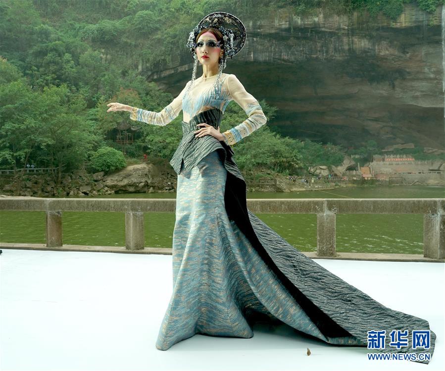 9月21日,模特在展示毛戈平的彩妆作品。 当天,一场名为“气蕴东方”的著名彩妆造型师毛戈平彩妆秀在重庆市万州区万州大瀑布景区上演,中国重庆国际时尚周同日落下帷幕。 新华社记者 陈建力 摄