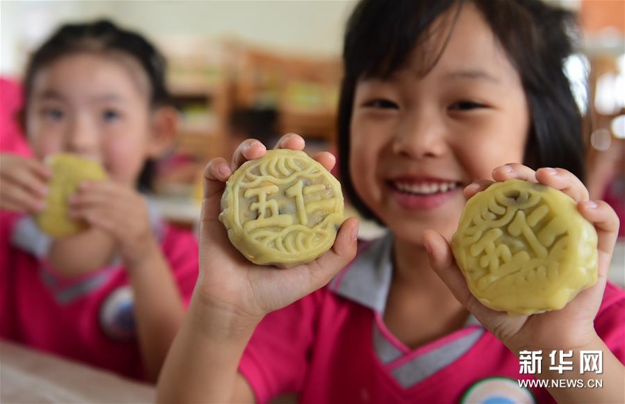 9月21日,沧州青县实验幼儿园的小朋友展示制作的月饼。新华社记者 王民 摄