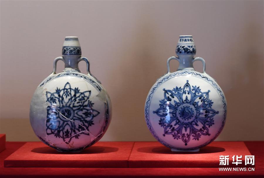 9月21日拍摄的青花斯伊兰花纹绶带耳葫芦扁壶,右为故宫院藏,左为景德镇出土修复件。新华社记者 金良快 摄