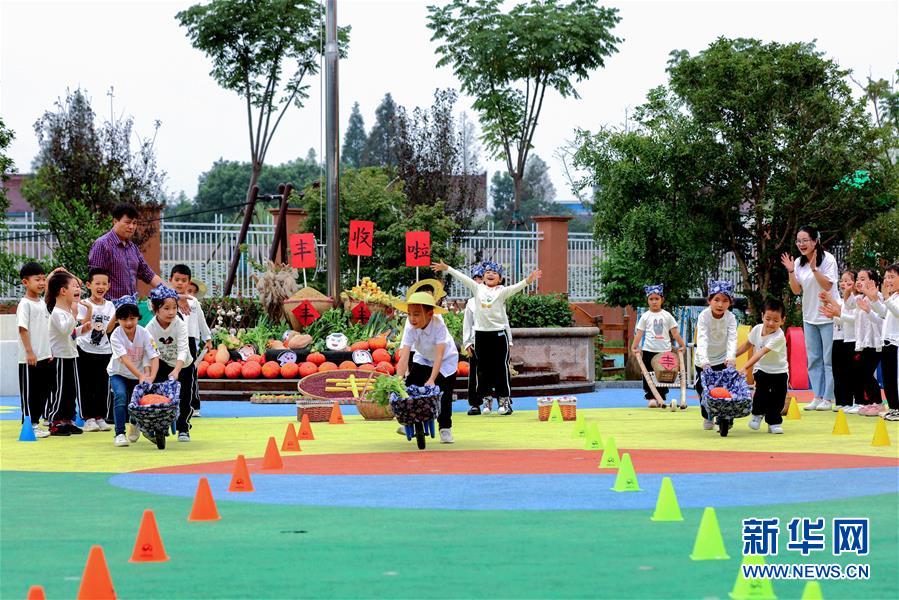 9月21日,孩子们参加“丰收搬运赛”活动。 当日,浙江省湖州市长兴县林城镇中心幼儿园开展“秋分晒秋迎丰收”活动。孩子们在老师的带领下通过“认一认农作物”“田园看穗”“丰收搬运赛”等趣味活动学习传统节气知识,感受乡村丰收的喜悦。 新华社记者 徐昱 摄