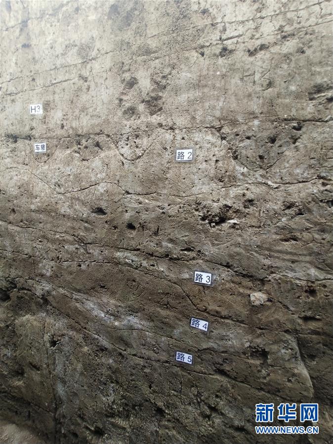 这是汉魏洛阳城西明门至青阳门大道遗址中的多期路土车辙叠压现象(资料照片)。 新华社发(中国社会科学院考古研究所 供图)