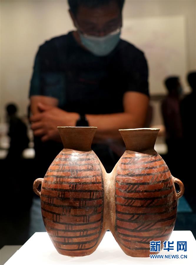 9月24日,参观者在河南博物院主展馆内观看展品“彩陶双连壶”。新华社记者 李安 摄