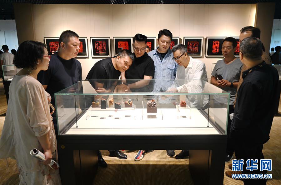 9月25日,参观者在欣赏展出的印章。 当日,由中国艺术研究院篆刻院等单位主办的第五届海峡两岸中青年篆刻大赛暨名家印章艺术邀请展在福建博物院开幕。本届大赛从来自北京、上海、福建、台湾等地1400多件参赛作品中,评选出105件优秀作品入展,并将从入展作品中评选出金、银、铜等奖项。 新华社记者 林善传 摄