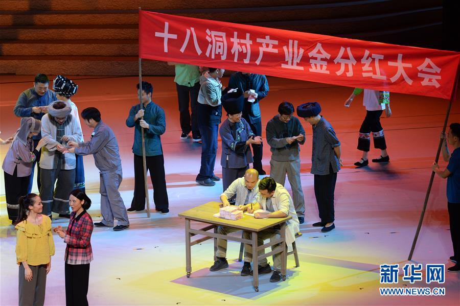 9月27日,演员在歌舞剧《大地颂歌》中表演。 当日,以湖南湘西十八洞村为原型创排的大型歌舞剧《大地颂歌》在长沙梅溪湖国际文化艺术中心首演。《大地颂歌》演出时长约两小时,采用“序言+6个故事+尾声”的结构,以多媒体场景剧演绎湖南“精准扶贫”的历程。 新华社记者 陈振海 摄