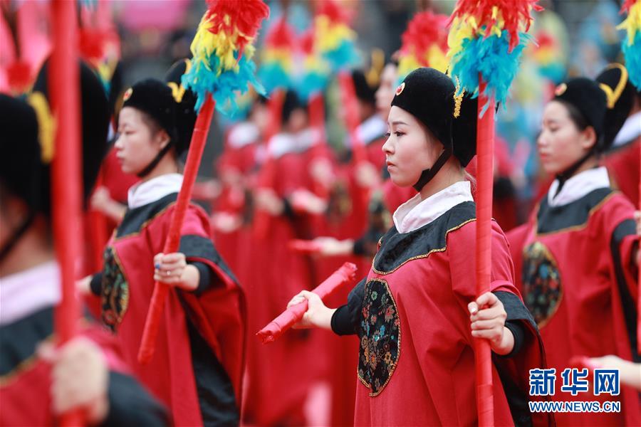 9月28日,参加祭祀的人员在祭孔典礼上表演八佾舞。