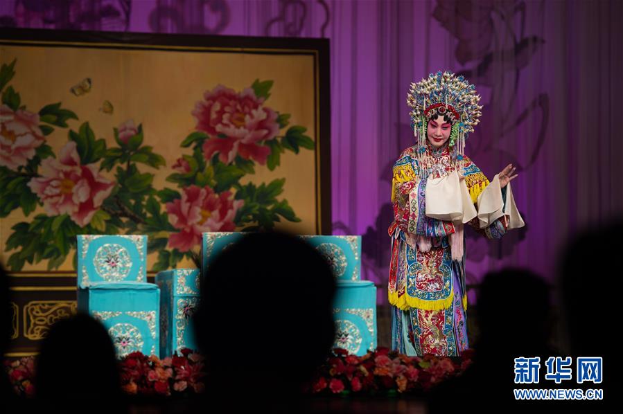 9月29日,京剧演员在台上演出《状元媒》片段。 9月29日,北京长安大戏院举办“纪念张君秋先生诞辰100周年”专场演出。 夜幕降临,涂粉、画油彩、穿戏服、戴头饰、吊嗓子……来自北京京剧院的演员们在后台忙碌起来。晚7点半,舞台大幕徐徐拉开,张派唱腔响彻戏院上空,引来票友们阵阵喝彩。 历时两个小时的演出,身居幕后的音乐、剧装、容妆、盔箱等工作人员与台前的演员密切配合,共同打造了一场精彩纷呈的京剧之夜。 新华社记者 陈钟昊 摄