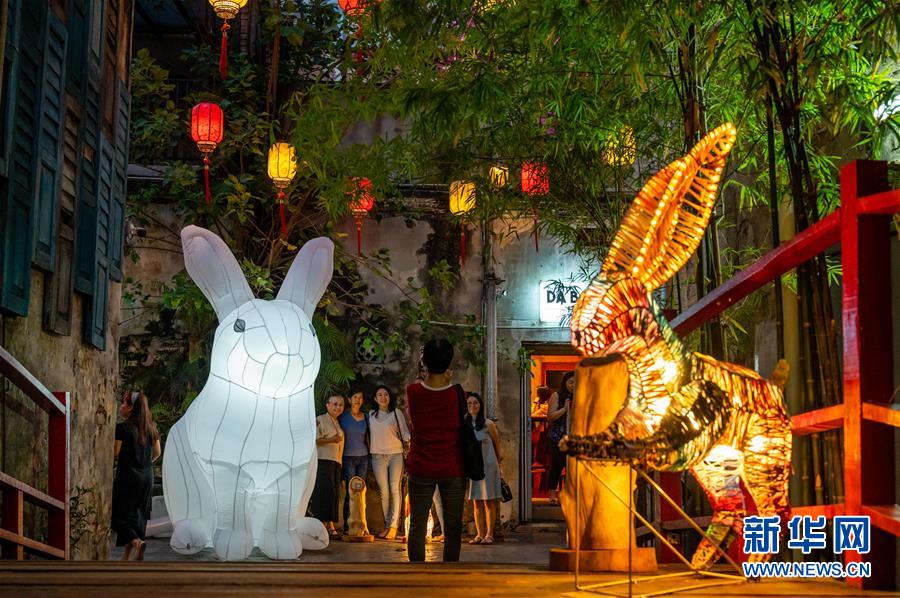 9月29日,在马来西亚吉隆坡鬼仔巷,人们与玉兔灯饰艺术品合影。新华社记者 朱炜 摄