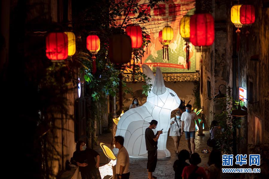 9月29日,人们在马来西亚吉隆坡鬼仔巷参观各式玉兔灯饰艺术品。新华社发(张纹综摄)