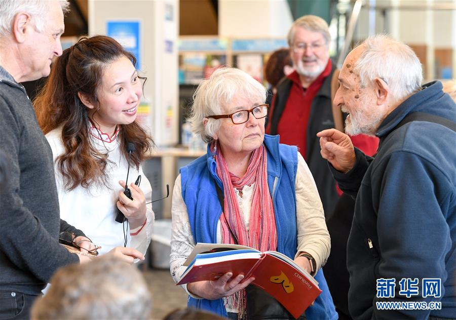 9月30日,在新西兰首都惠灵顿的下哈特图书馆,当地中国文化爱好者与惠灵顿中国文化中心老师张岚交谈。 在中国国庆、中秋双节到来之际,“月满四川·中秋文化工坊”9月30日走进新西兰首都惠灵顿的下哈特图书馆。 新华社记者 郭磊 摄