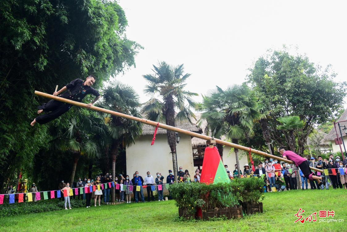 2020年10月1日,云南民族村为广大游客安排了丰富精彩的民族特色活动。游客可近距离与景区的云南25个少数民族共同庆祝节日,感受浓浓的民族风情。(李明摄/光明图片)