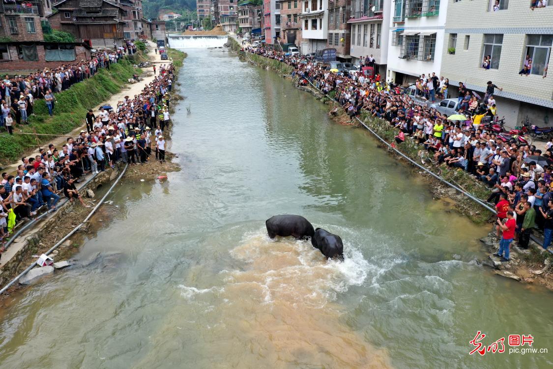 2020年10月2日,在广西柳州市三江侗族自治县独峒镇平流村,村民和游客在观看斗牛比赛。(潘志祥摄/光明图片)