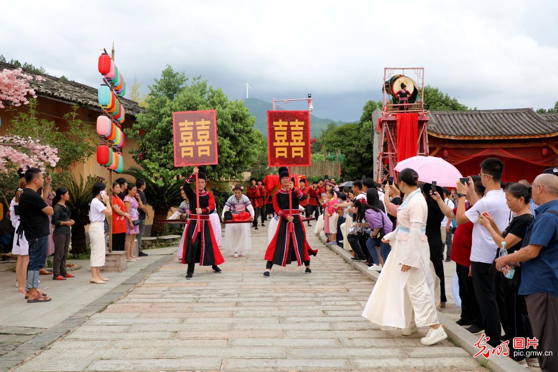 2020年10月2日,游客在江西省赣州市全南县雅溪古村景区,观看沉浸式实景演出《雅溪唐鉴》。(尹其奇摄/光明图片)