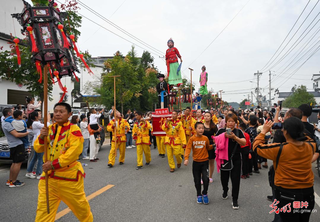 2020年10月2日,江西省婺源县赋春镇甲路村村民举行抬阁在村中巡游,以此丰富多彩的传统民俗活动欢度国庆中秋双节长假,吸引着许多游客驻足拍照。(王国红摄/光明图片)