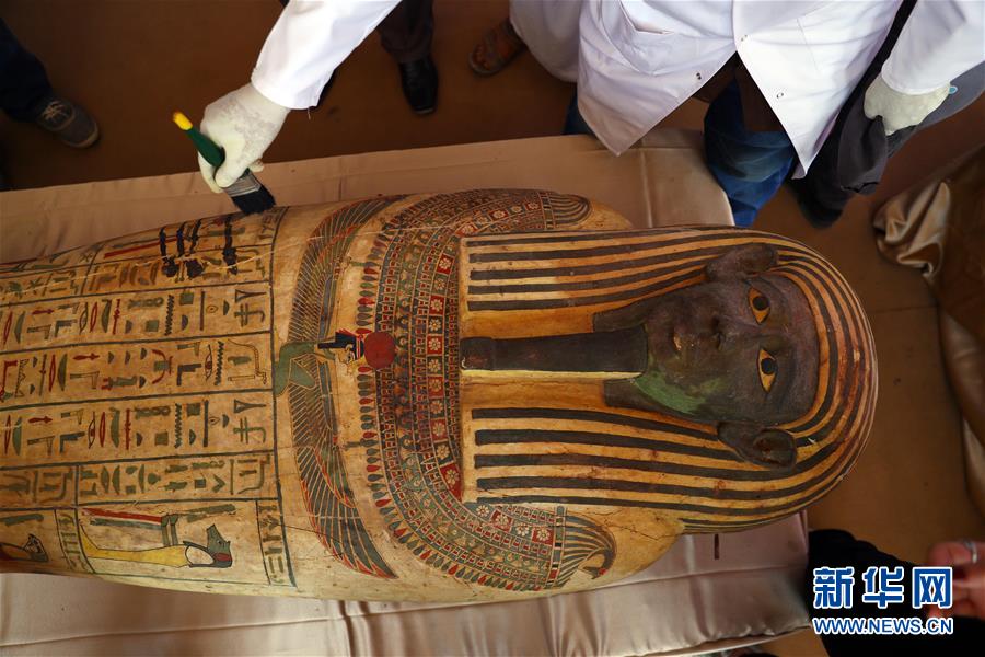 这是10月3日在埃及吉萨省塞加拉地区考古现场拍摄的出土木棺。 埃及旅游和文物部官员3日宣布,考古队在吉萨省一个单独墓穴中发掘出59具距今约2500年的木棺。 新华社发(艾哈迈德·戈马摄)