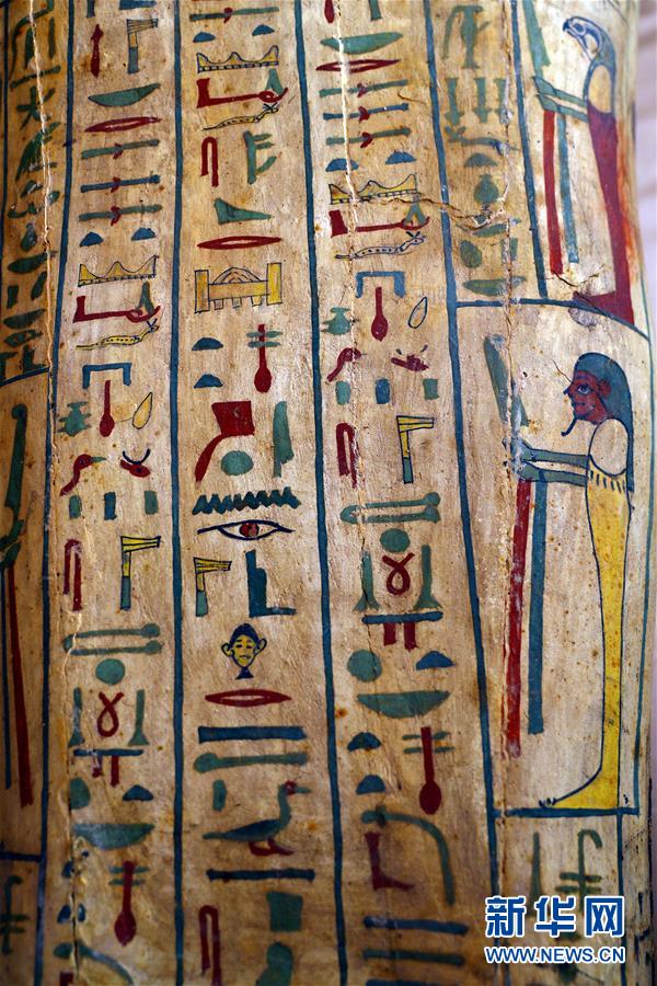 这是10月3日在埃及吉萨省塞加拉地区考古现场拍摄的出土木棺上的象形文字。 埃及旅游和文物部官员3日宣布,考古队在吉萨省一个单独墓穴中发掘出59具距今约2500年的木棺。 新华社发(艾哈迈德·戈马摄)