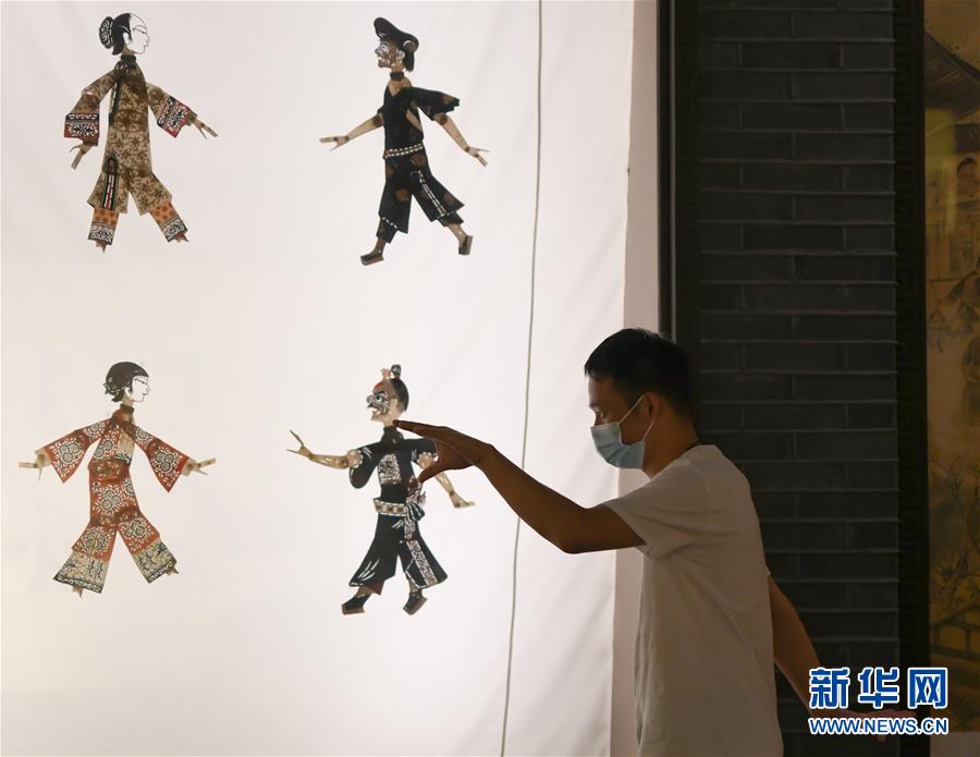 10月4日,游客在四川博物院模仿皮影展品中的造型。 中秋和国庆长假期间,不少游客前往四川博物院,观文物、学历史、长见识。 新华社记者 唐文豪 摄