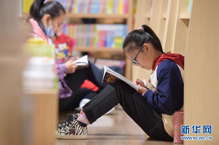 10月5日,小朋友在呼和浩特市青城阅立方书店读书。 国庆、中秋“双节”期间,内蒙古自治区呼和浩特市众多市民来到书店选购、阅读书籍,在书香中过假期。 新华社记者 李志鹏 摄