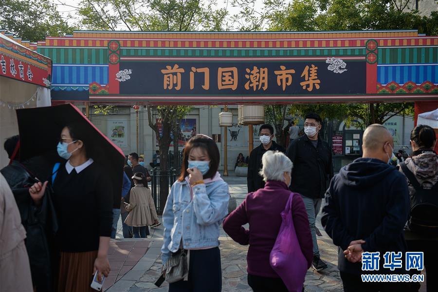 10月6日,游客前往前门国潮市集游览。 近日,“老字号+新京范儿”跨界市集在北京前门大街亮相。市集集合了便宜坊、都一处、天兴居、全聚德、丰泽园等京城老字号以及故宫宫廷文化、戏精学院、亮相天乐园、天街冰冰等新文创。 新华社记者 彭子洋 摄