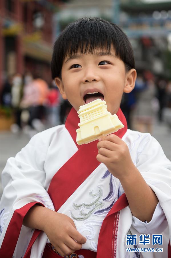 10月6日,一名小朋友吃着特色冰淇淋。 近日,“老字号+新京范儿”跨界市集在北京前门大街亮相。市集集合了便宜坊、都一处、天兴居、全聚德、丰泽园等京城老字号以及故宫宫廷文化、戏精学院、亮相天乐园、天街冰冰等新文创。 新华社记者 彭子洋 摄