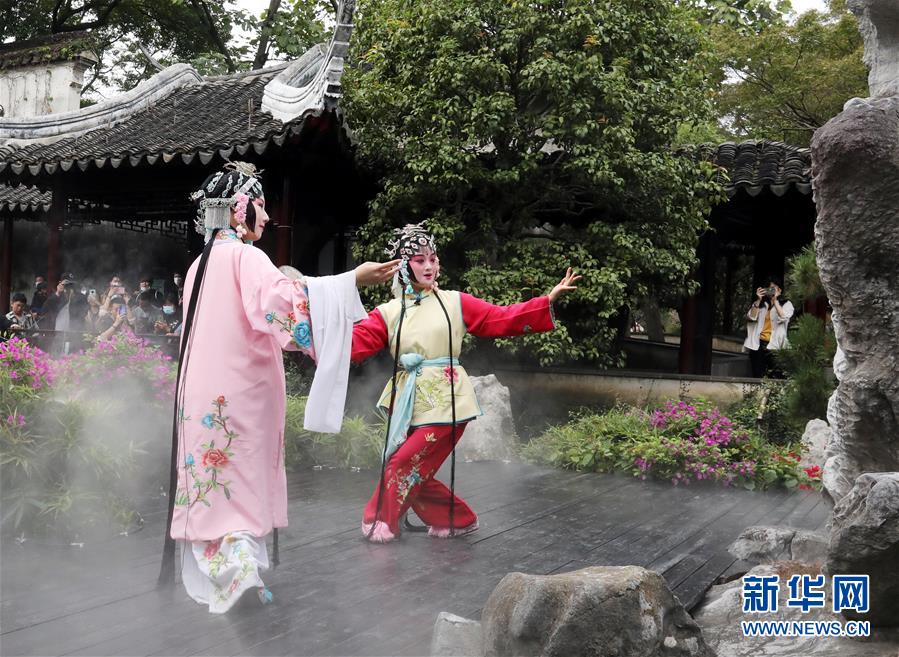 10月7日,游客在苏州留园观看实景版昆曲《牡丹亭》。 国庆中秋长假期间,江苏苏州古典园林留园推出实景版昆曲《牡丹亭》,吸引游客驻足观看。 新华社发(杭兴微 摄)