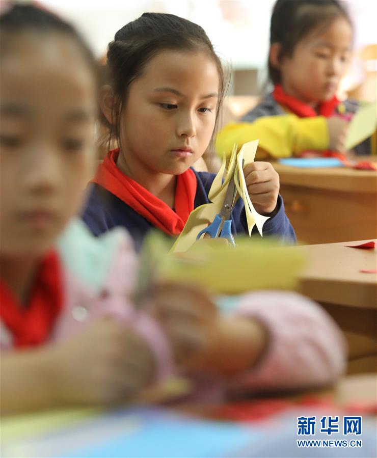 10月9日,苏州工业园区星海小学的学生在体验剪纸技艺。 当日,江苏苏州工业园区星海小学开展“传统文化手工制作体验“活动,孩子们在当地手工艺人的指导下,学习剪纸、棕编等手工技艺,感受传统文化。 新华社发(杭兴微 摄)