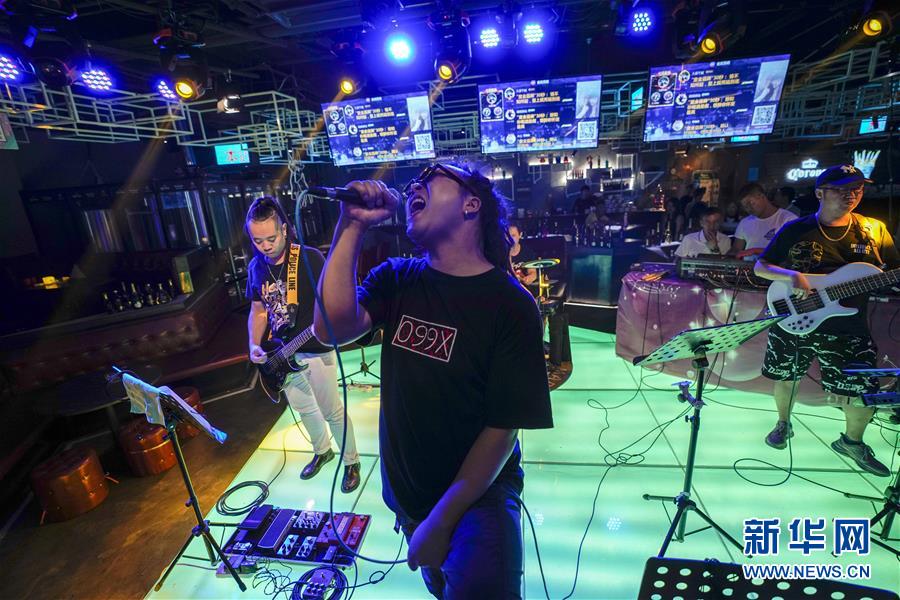 歌手在新疆乌鲁木齐一所购物中心的酒吧里演唱(2019年7月14日摄)。新华社记者 赵戈 摄