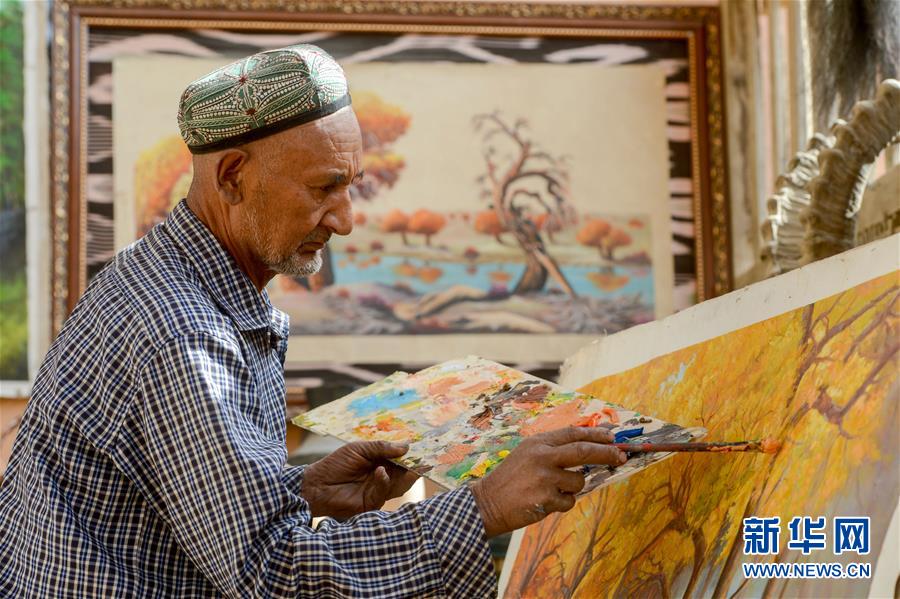 在新疆墨玉县库木艾日克村,农民画家阿卜力克木·麦麦提敏在家中练习绘画(2019年3月5日摄)。新华社记者 丁磊 摄