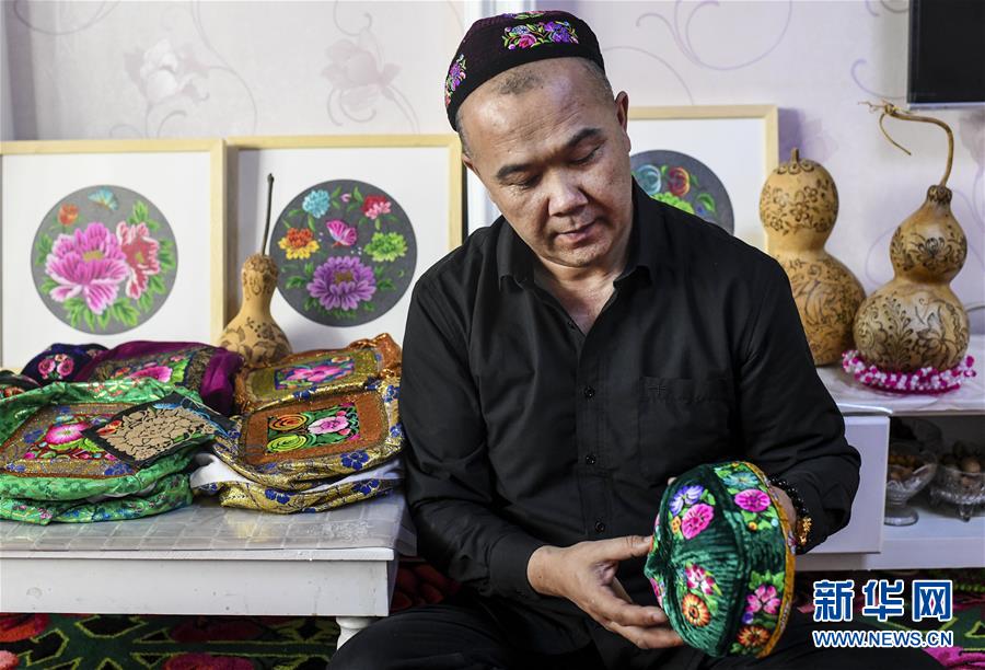 卡德尔·热合曼在新疆哈密市伊州区的家中展示他绣制的花帽(2019年3月8日摄)。热爱传统刺绣的卡德尔因刺绣事业,不仅有了固定收入,还带动周围村庄的上百名“绣娘”组成专业刺绣团队。新华社记者 王菲 摄