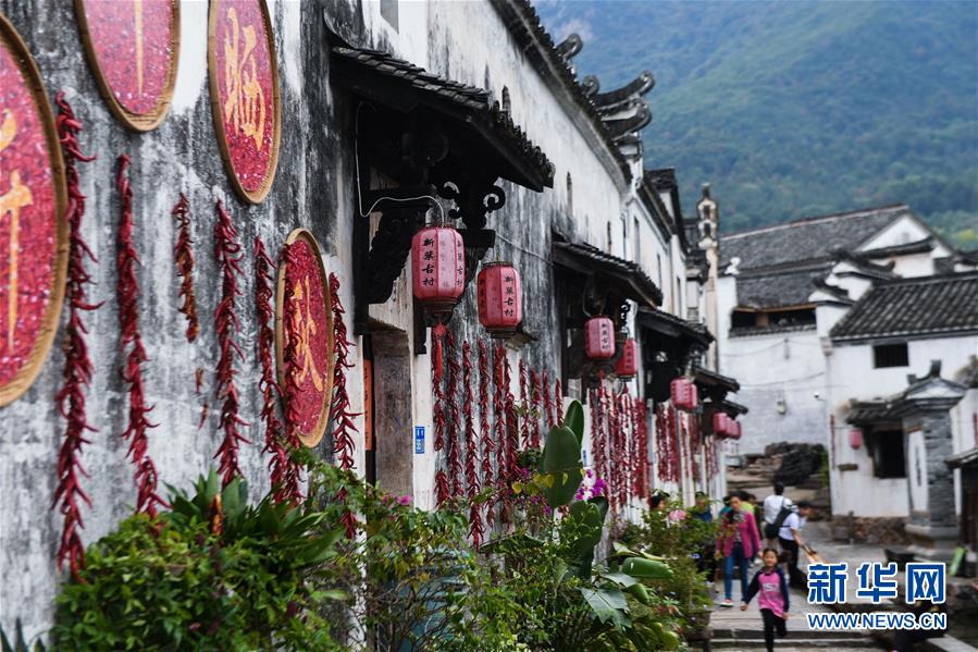 10月15日,游客们在游览新叶古村。 近日,浙江省建德市大慈岩镇新叶古村举办“晒秋节”,村民们将玉米、南瓜、辣椒等农作物摆放在古村落各处,五颜六色的农作物与传统民居构成一道道美丽的风景,吸引游客纷至沓来。 新叶古村是一个有着800多年悠久历史的古老村落,这里至今完好地保存着16座古祠堂、古大厅、古塔、古寺和200多幢古民居建筑。 新华社记者 徐昱 摄