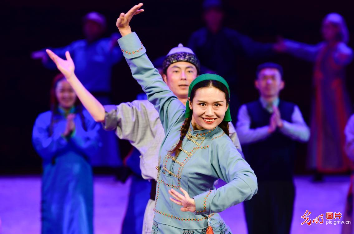 2020年10月16日,由内蒙古阿拉善乌兰牧骑编创排演的原创话剧《东风呼啸起》在阿拉善盟金色胡杨音乐厅上演。该剧以额济纳人民为支援国家建设东风航天城,无私奉献出自己世代生息家园的真实历史为素材,讲述了军民团结,亲如一家的动人故事,展现了蒙古族土尔扈特部人民勇敢坚毅的性格和忠诚担当的爱国精神。(王正摄/光明图片)